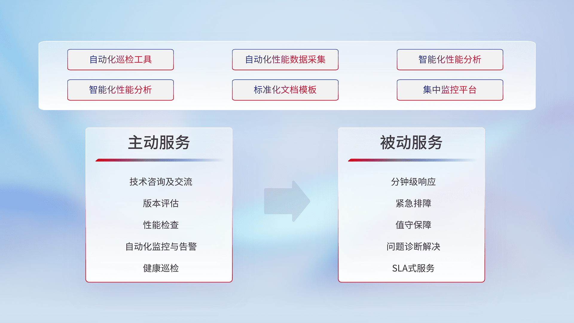 智能化工具和标准化文档,,,,保障服务质量,,,,提供主动服务(包含技术咨询、、、、版本评估、、性能检查、、、自动化监控与告警、、、健康巡检)和被动服务包含(分钟级响应、、、紧急排障、、、值守保障、、、问题诊断解决、、、、SLA服务)。。。。